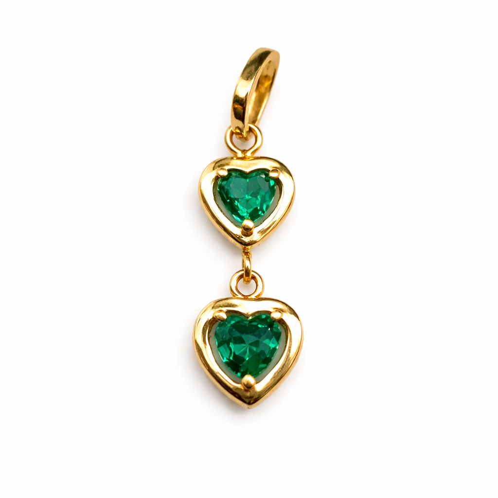 Este dije artesanal presenta un diseño encantador de dos corazones enlazados, elaborados en oro y engastados con esmeraldas de un verde intenso. La disposición vertical de las gemas crea una pieza equilibrada y sofisticada, perfecta para expresar sentimientos de amor y conexión.
