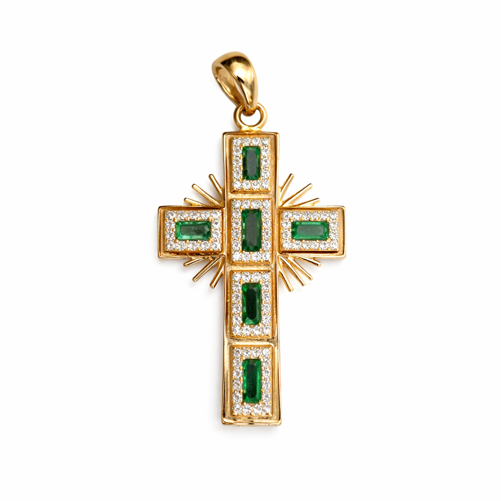 Este dije artesanal en forma de cruz es una pieza que une lujo, tradición y simbolismo. Elaborado en oro, cada segmento está adornado con esmeraldas de corte rectangular, rodeadas por delicados diamantes que realzan su resplandor. El diseño radiante y detallado convierte esta joya en un accesorio único, capaz de transmitir tanto espiritualidad como sofisticación.